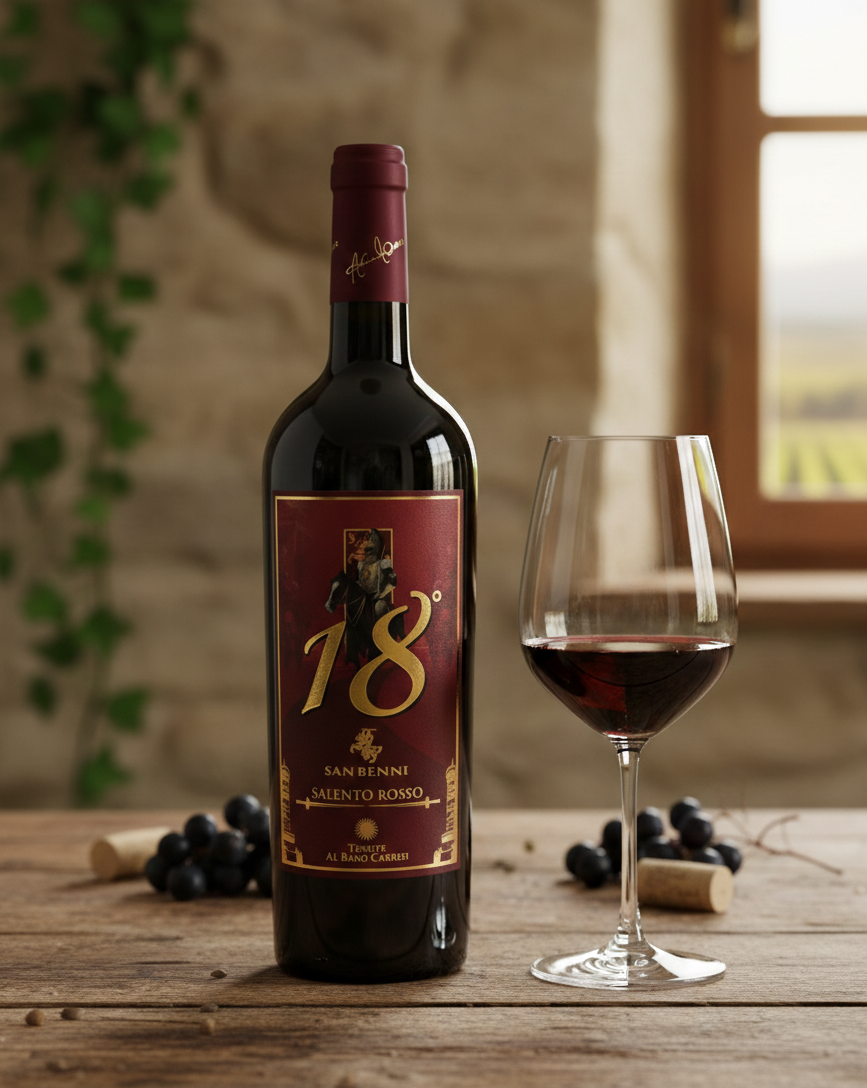Immagina di versare un calice di 18° San Bennì Rosso Salento IGT, un Primitivo pugliese che celebra 18 mesi di affinamento in barrique, donandogli un colore rubino profondo e un bouquet di frutta matura, spezie e note tostate. Prodotto dalle Tenute Albano Carrisi, racchiude la forza della terra salentina in ogni sorso: strutturato, caldo (14% vol.), con tannini vellutati e un finale persistente. Perfetto per chi cerca un rosso potente e autentico dal cuore del Salento.